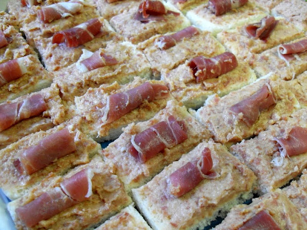 Cortar el pan de molde en rectángulos pequeños de 4 x 2 cm, untar con el paté y colocar encima un rollito de jamón serrano.