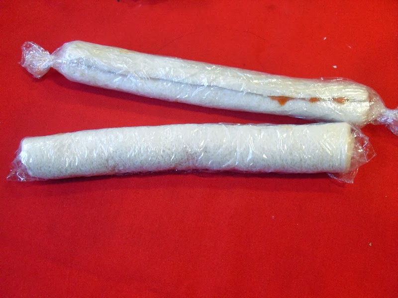 Coger pan de molde en láminas o lamas sin corteza a lo largo, untar una capa de sobresada enrollar y envolver con film. Hacer lo mismo con una capa de foie y enrollar. Refrigerar unas horas y cortar en rodajas de 2 cm. aprox.