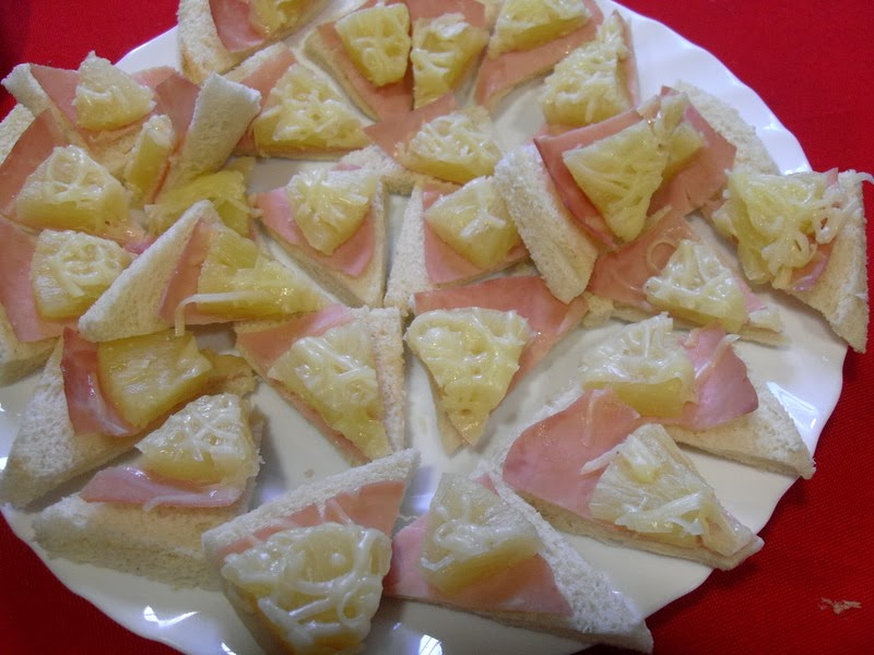Triángulos de jamón de York y piña, gratinado con queso.