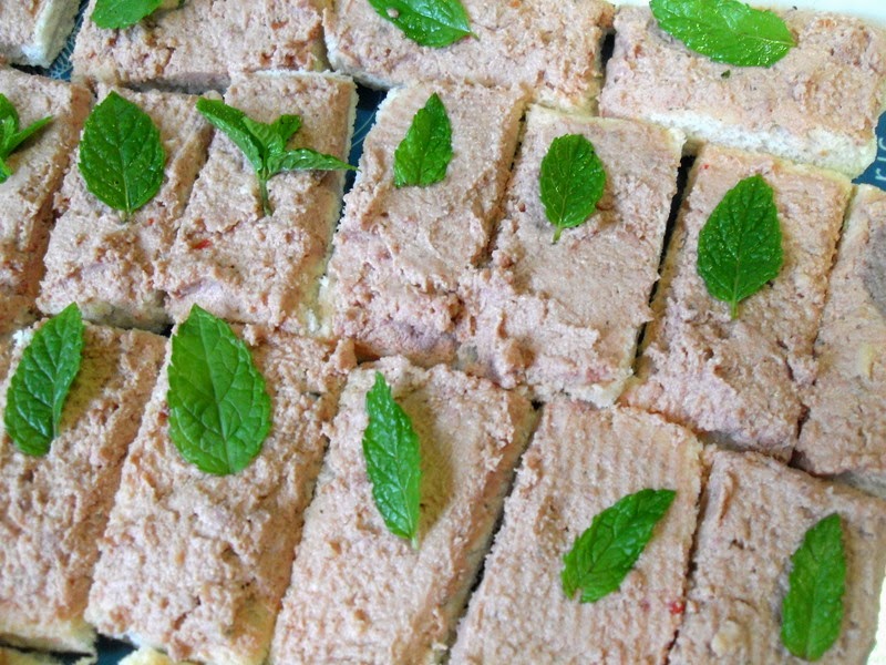 Cortar rectángulos igual que los anteriores, untar de paté y colocar una hoja de menta fresca.