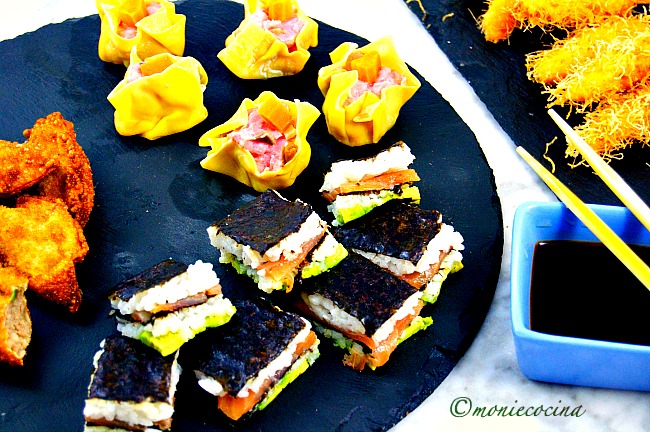 Gyoza fritos, Langostinos rebozados en fideos, Cuadrados de sushi y Shaomai cantonés.
