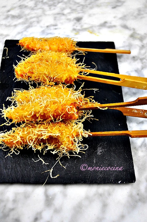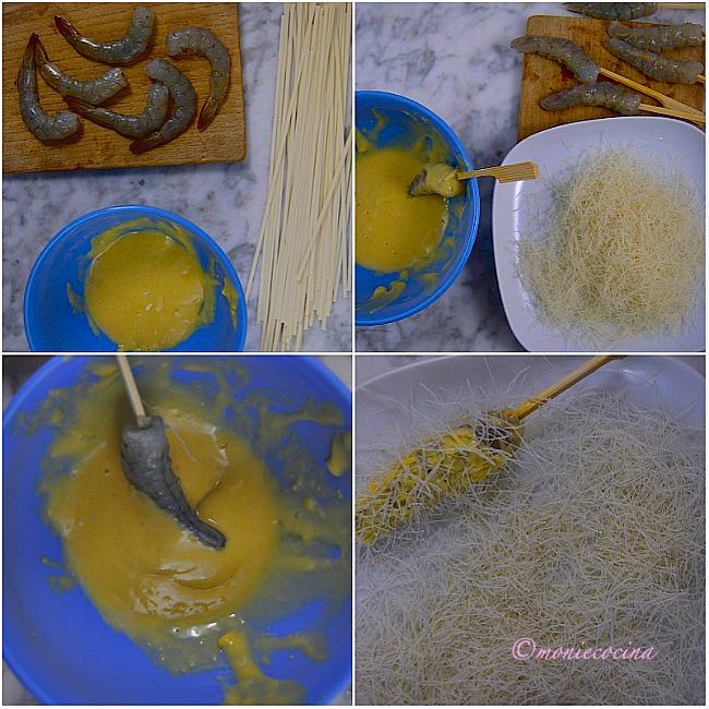Colocamos los langostinos en un palo de brocheta, lo pasamos por la mezcla y después por los fideos, así conseguimos que se queden pegados.