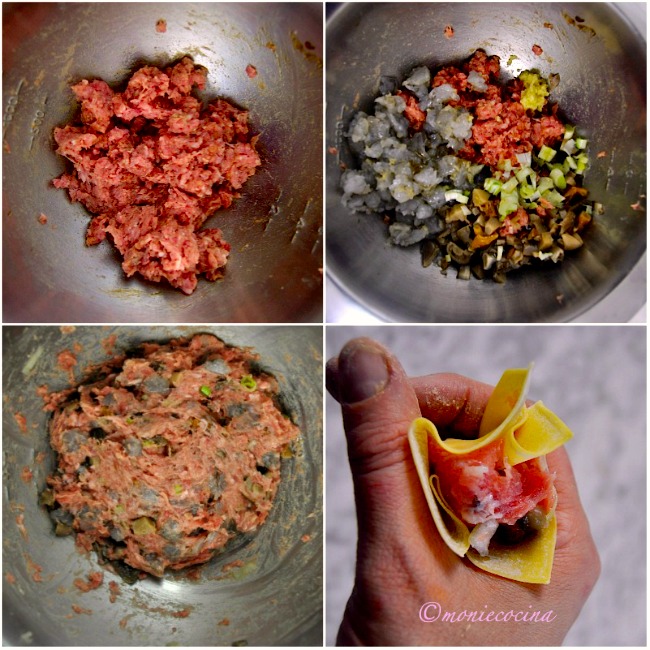 Abrimos las salchichas para tener la carne picada, la ponemos en un bol salpimentamos y añadimos picaditas las setas, la parte verde de la cebolleta y las castañas de agua, todo muy picado.