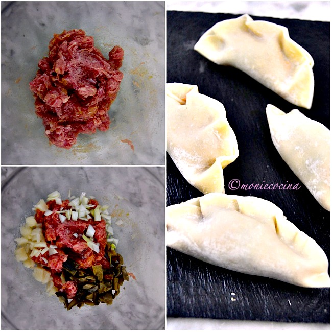 Colocamos un poco de la masa en el centro de cada masa wonton y pintamos con un poco de agua todo el borde de la circunferencia para pegar la empanadilla. Hacemos unos pliegues y dejamos reposar las gyozas en la nevera unos minutos.