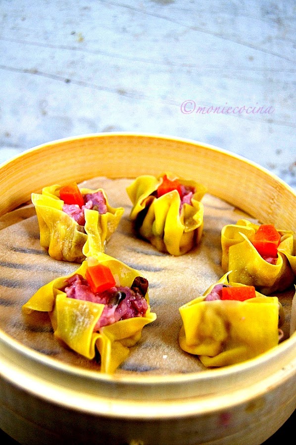 Tomamos una masa wonton, ponemos un poco de relleno en el centro y cerrando la mano conseguimos un saquito. Decoramos arriba con un cuadradillo de zanahoria para dar color.