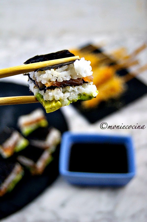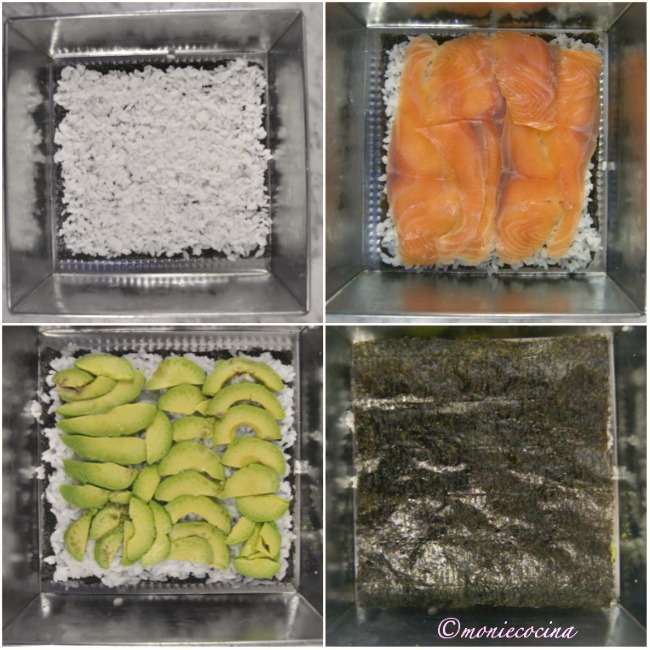 En un molde cuadrado colocamos una capa de alga nori, luego una de arroz, una de salmón. Otra alga nori, otra de arroz, encima aguacate laminado y terminamos con otra alga nori.