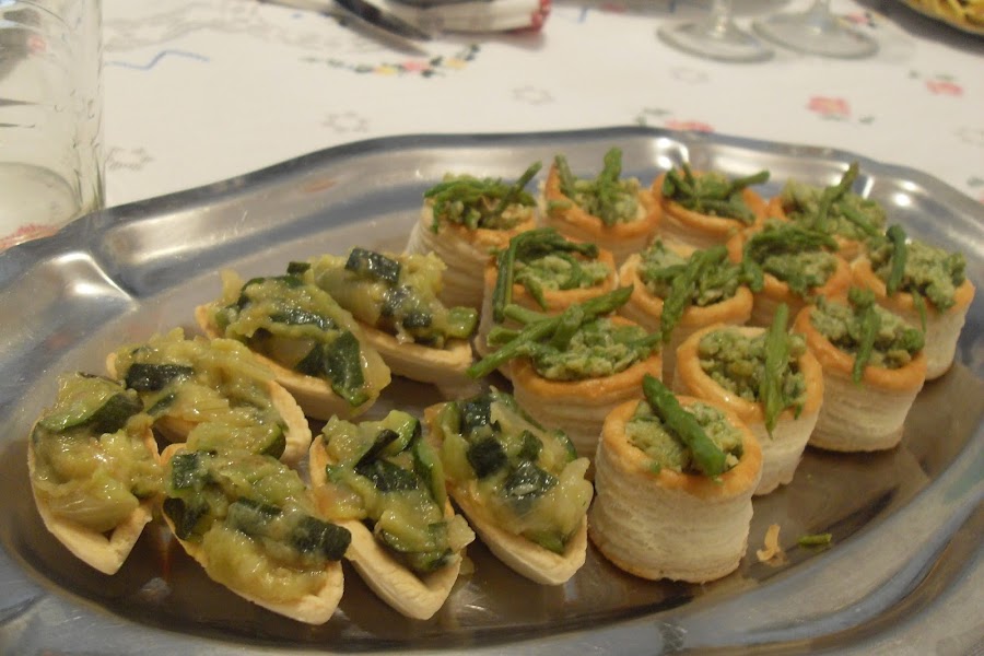 Tartaletas y barquitas de calabacín y cebolla confitada.