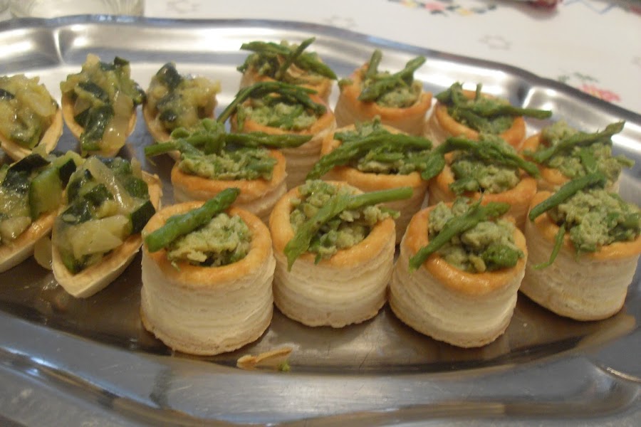 Volovanes rellenos de revuelto de corazones de alcachofa y espárragos trigueros.