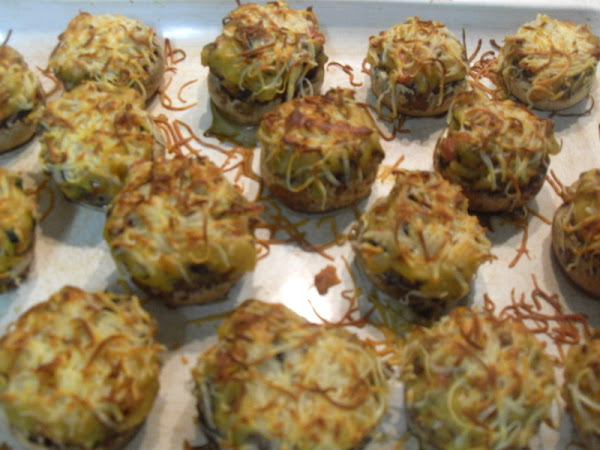 Rellenar los champiñones y espolvorear con queso para fundir, introducir en el horno unos 20 minutos aproximadamente, hasta que el queso este gratinado.