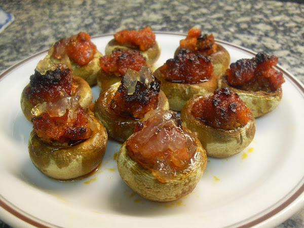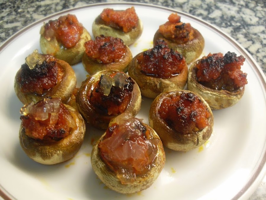 Champiñones rellenos de sobrasada con cebolla caramelizada