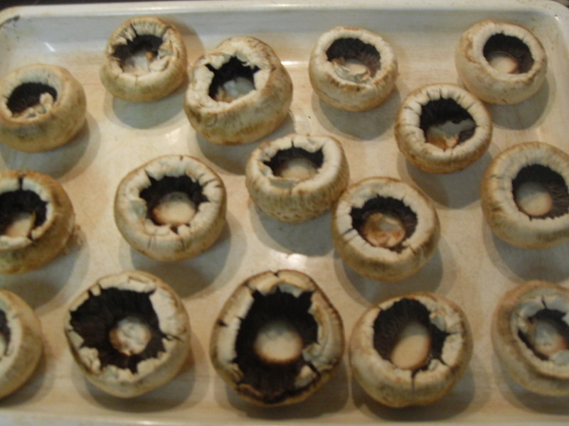 Limpiar con cuidado los champiñones, separar el sombrero del tallo, quitar la parte terrosa del tronco, el resto del tronco se aprovecha picado para el relleno.