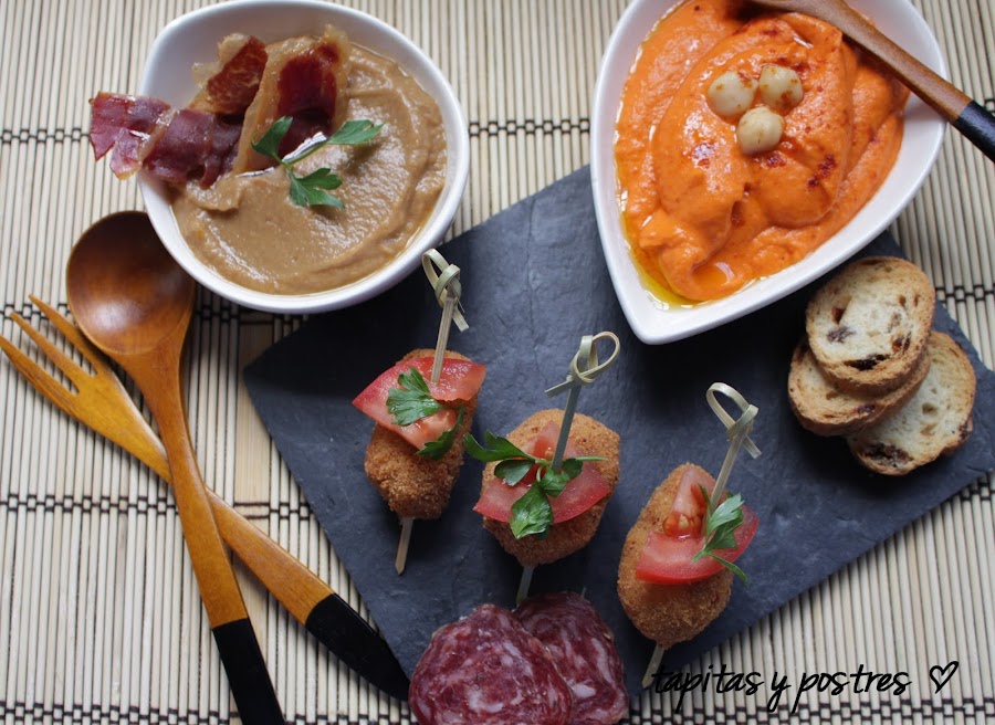 Y para acompañar a las croquetas, os recomiendo este hummus de pimientos del piquillo, que podemos servir con unas tostaditas o con bastoncitos de verdura cruda. Este plato tiene una receta supersencilla que puedes ver aquí.