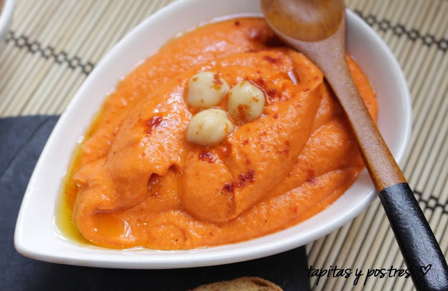 El hummus tradicional se prepara solo con garbanzos, a este lo hacemos especial si le añadimos pimientos del piquillo