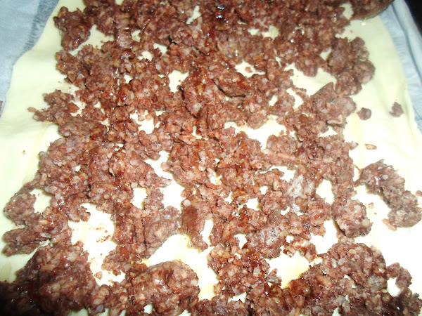 Desprendemos las tripas de la morcilla y machacamos el contenido junto a 2 cucharadas soperas de miel.