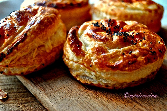 Comenzamos cortando el queso brie en rodajas de unos 5 centímetros, lo mismo con la sobrasada. Con un cortador redondo marcamos el hojaldre y hacemos 12 círculos, 6 para la base y 6 de tapa.
