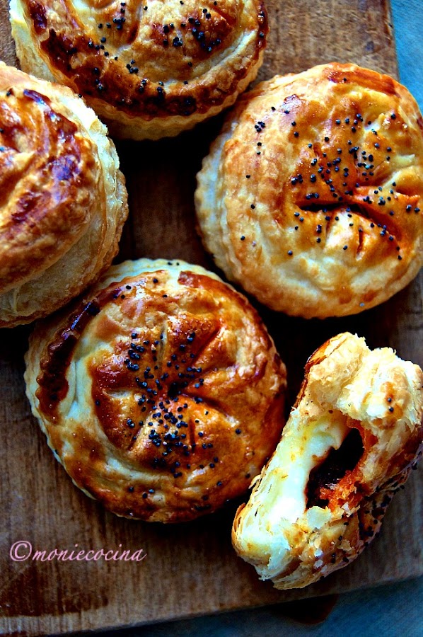 Comenzamos cortando el queso brie en rodajas de unos 5 centímetros, lo mismo con la sobrasada. Con un cortador redondo marcamos el hojaldre y hacemos 12 círculos, 6 para la base y 6 de tapa.