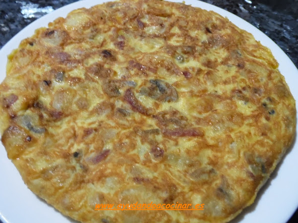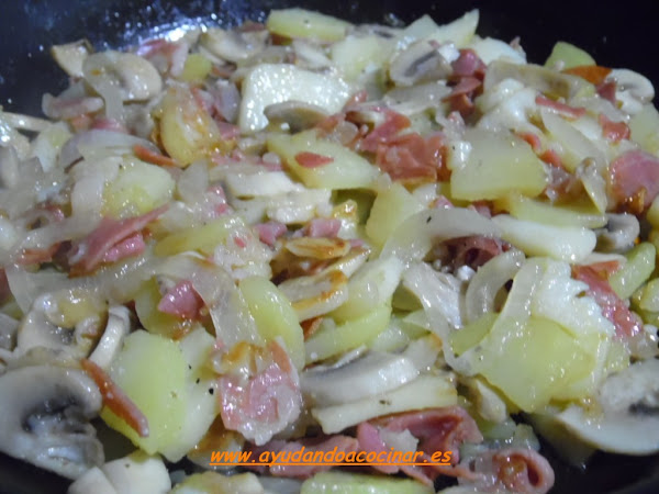 Cuando el aceite se empiece a calentar incorporar las patatas y cebolla ya cortada, remover y dejar rehogar uno minutos que la cebolla empiece a ablandarse, agregar el jamón picado en trozos pequeños, los champiñones fileteados y remover.