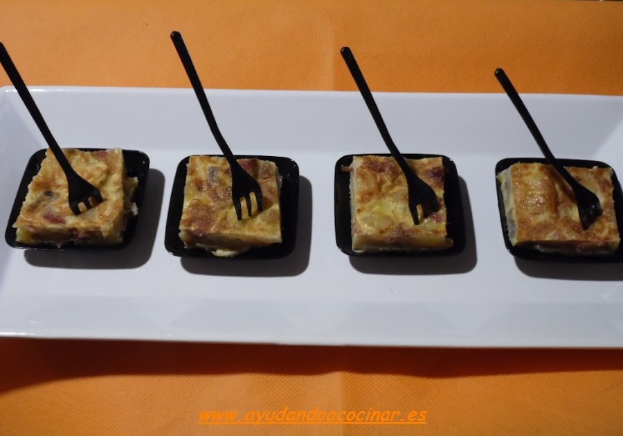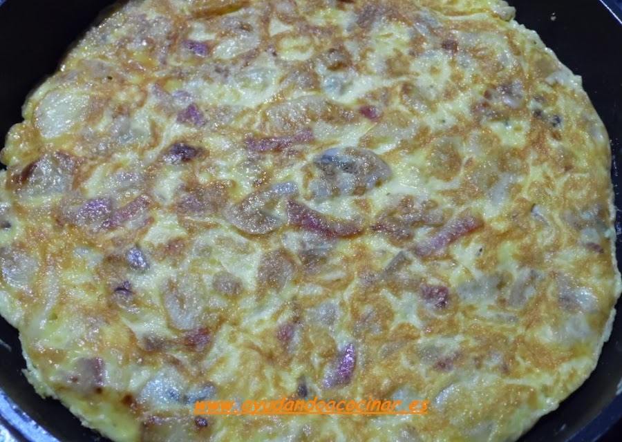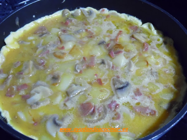 Poner una sartén a fuego medio con una cucharada de aceite de oliva virgen, dejar que se caliente éste. Incorporar la mezcla anterior, cocinar a fuego mas bien bajo y dejar que se cuaje por la parte inferior.