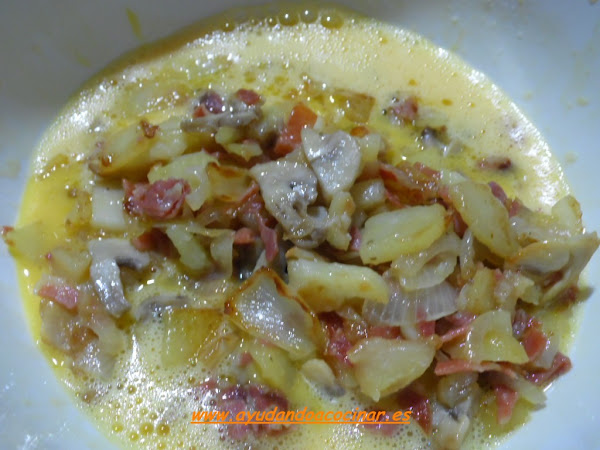 En otro recipiente echar los cuatro huevos poner un poco de sal (cuidado con la sal ya que en el paso anterior hemos agregado jamón) y batir.