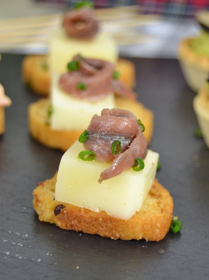 1.- ¡Vamos a por el más fácil de todos! Solo tenemos que hace unos dados del queso que más nos guste, nosotros usamos un queso manchego curado, y le añadimos encima una anchoa enrollada.
