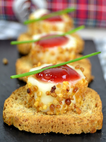 2.- Colocamos el queso sobre una base de pan tostado y añadimos sobre le queso un puntito de mermelada, en este caso de fresa.