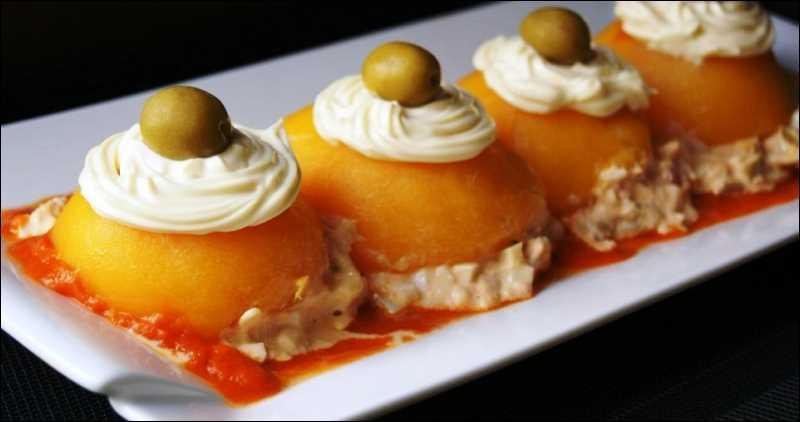Desde el blog Cocina Familiar con Javier Romero, te traigo unos ricos Melocotones rellenos de txaca (receta aquí). Se prepara una ensaladilla con atún, surimi, olivas rellenas, huevo duro y mayonesa y se rellenan los melocotones. Luego se colocan sobre un lecho de salsa de tomate volteados y se decoran con mayonesa y olivas. Se sirve bien frequito y el contraste de sabores es una verdadera delicia!