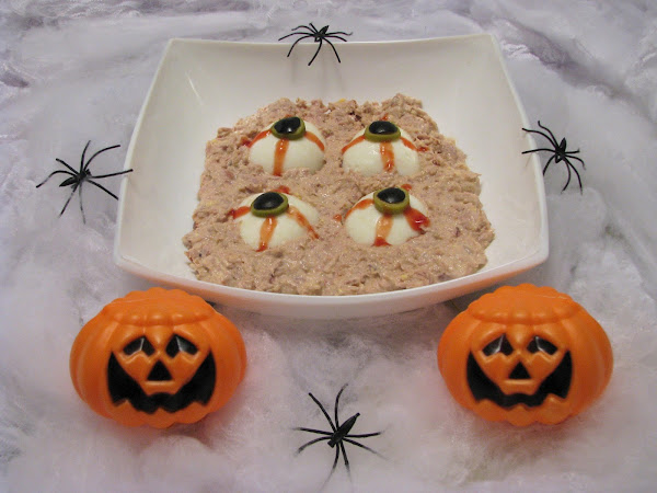 - Coloca el resto de la pasta de atún alrededor de los huevos de forma uniforme.