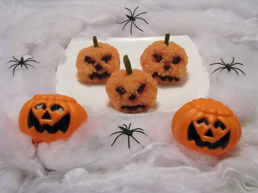 - Para hacer los ojos, la nariz y la boca debes coger el arroz con colorante marrón, aplastarlo un poco para hacer una masa y colocarlo a tu gusto para darle una expresión terrorífica a las calabazas.
