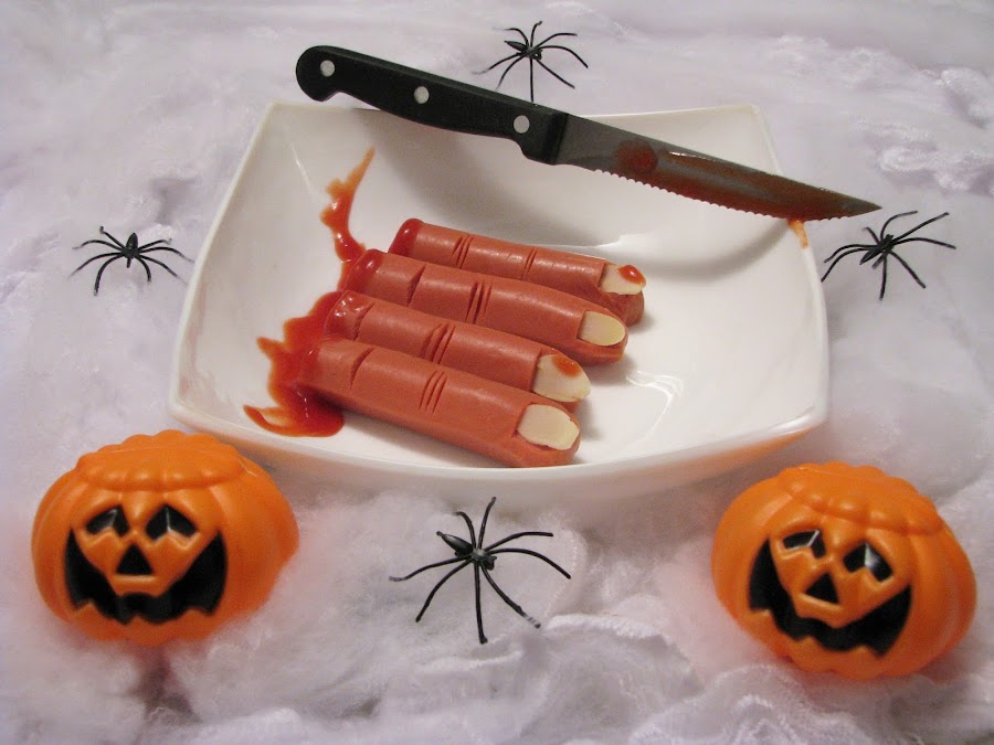 - Recorta uno de los extremos de cada una de las salchichas para que tenga un tamaño un poco más grande que un dedo normal y haz cortes en ella simulando las falanges de los dedos.