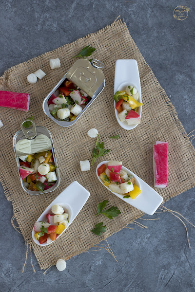 Las perlas de mar son pequeñitas por lo que dejaremos del mismo tamaño. Ponemos en un bol. El snow crab o palitos de mar también lo cortamos en lonchas. Cortamos los pimientos en cuadraditos pequeñitos. Y picamos la cebolla también pequeñita. Añadimos todo al bol. Ponemos sal y AOVE. Removemos bien. Repartimos en cucharitas o en latitas. Espolvoreamos con perejil picado.