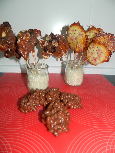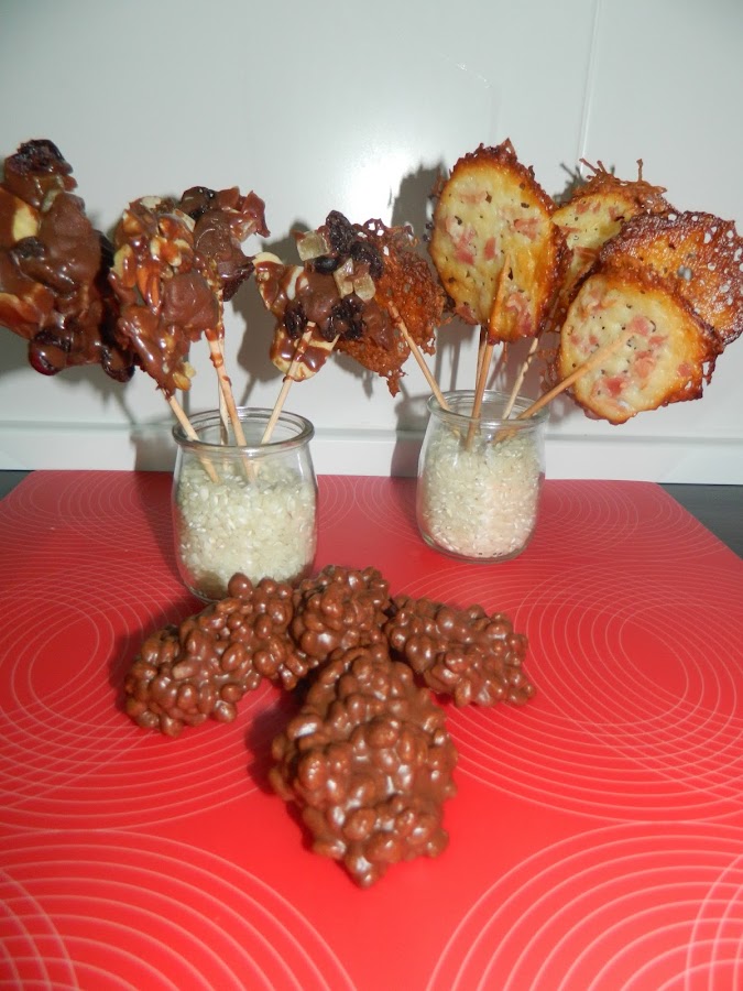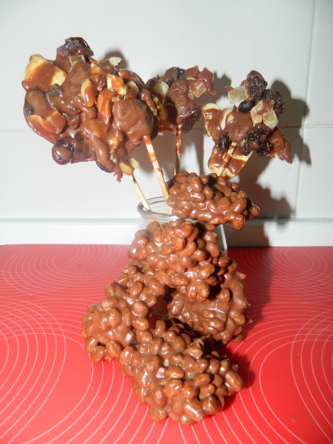 ¿Que hacemos? Empezaremos por las piruletas de chocolate y las rocas de cereales y chocolates que tardarán más por tener que enfriarse el chocolate.