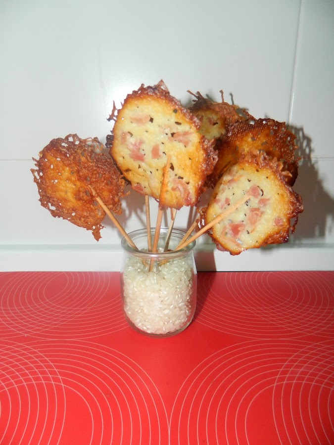 Para las piruletas de queso y las de queso y bacon, empezamos encendiendo el horno a 200ºC así se precalienta. Continuamos rayando el queso y sobre otro papel de horno en una bandeja para horno hacemos montones como los anteriores, ponemos el palillo y chafamos un poco. Ha unas le hemos puesto unos trocitos de bacon cortado muy pequeño. Cuando el horno este caliente las metemos, tardaran unos 5 minutos, cuando veamos que se han dorado están lista, sacamos la bandeja del horno y esperamos que se enfríen para poder retirarlas sin que se rompan.