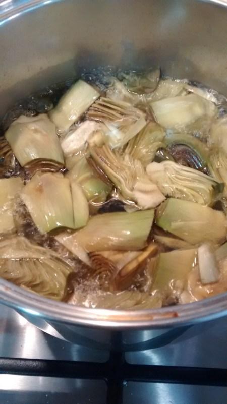 Las alcachofas cortarlas en cuartos y ponerlas en un bol con agua y un chorro de limón para evitar que se oxiden y se pongan negras. Reservar y escurrir en el momento que vayamos a freírlas.