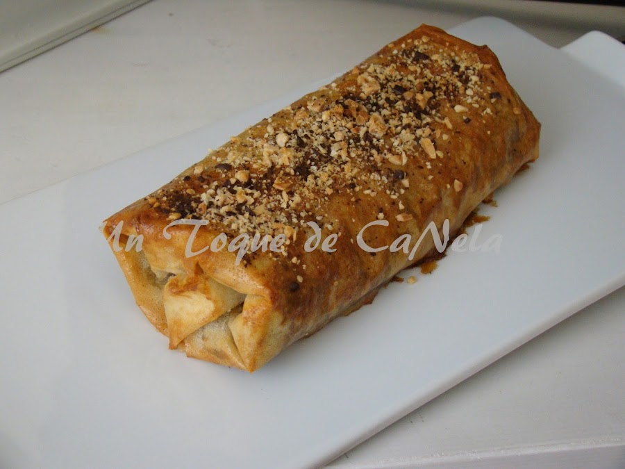 Echar el chocolate, las nueces y enrollar sobre sí mismo. Cerrar bien las esquinas.