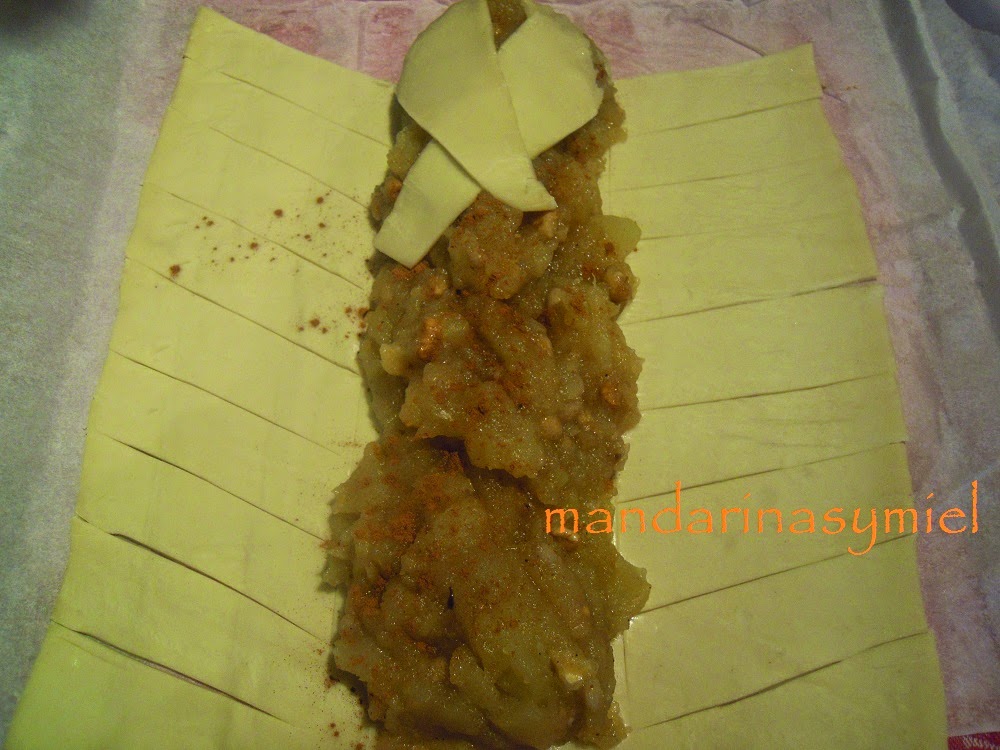 Ves cerrando la trenza superponiendo las tiras de hojaldre.