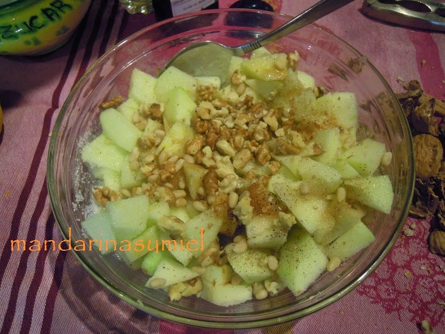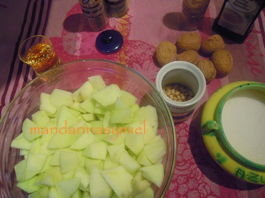 En un bol que pueda ir al microondas, coloca las manzanas, el azúcar, las nueces en trocitos pequeños, los piñones, la canela y demás especias, la cucharada de esencia y el chupito de ron, mezcla todo bien.