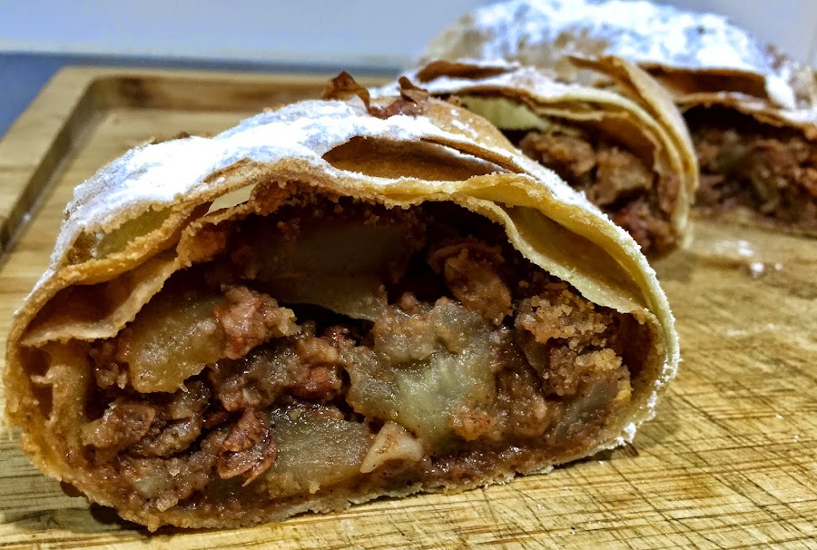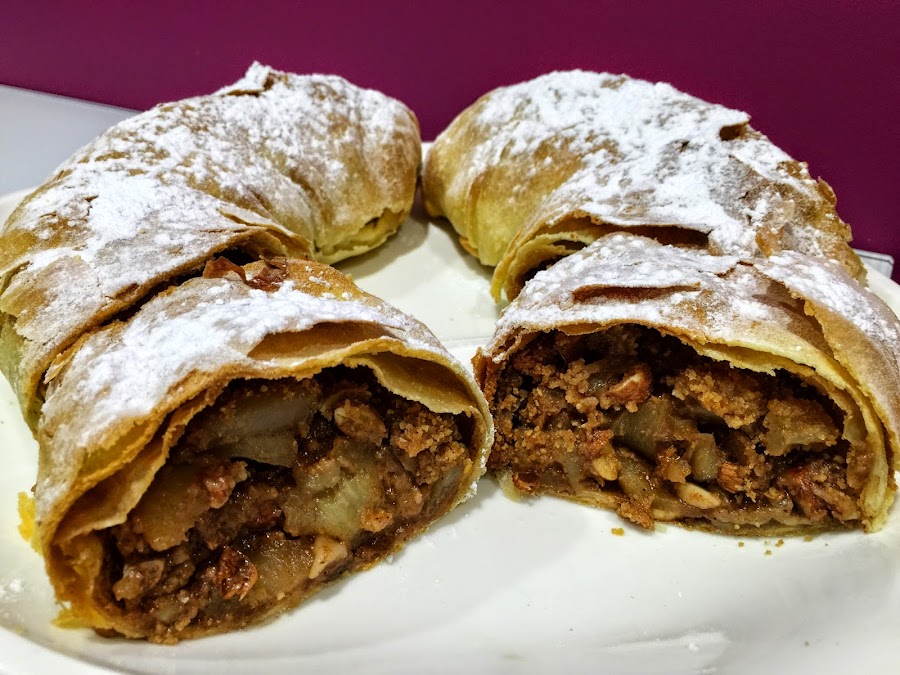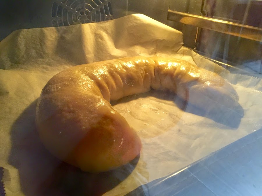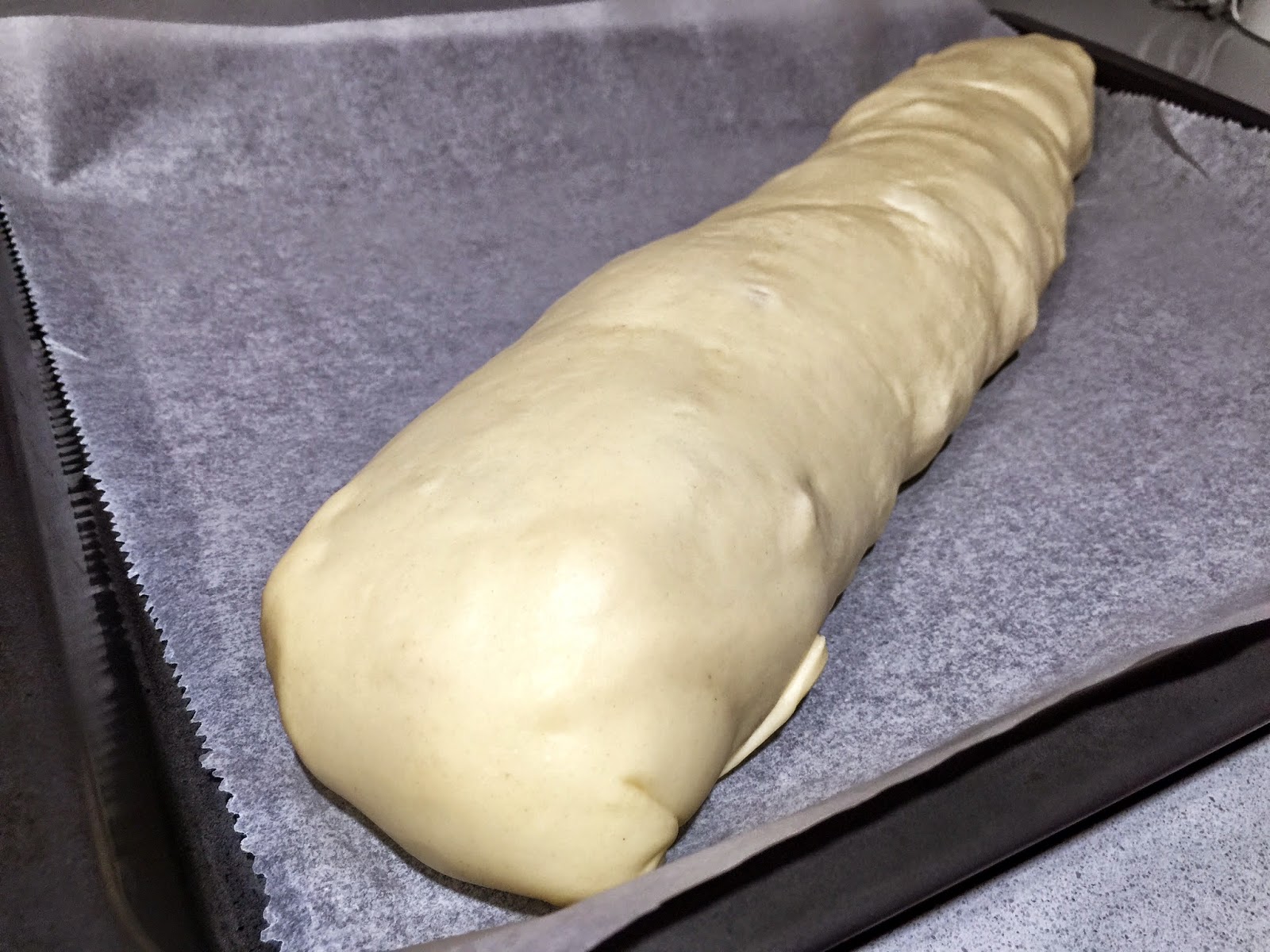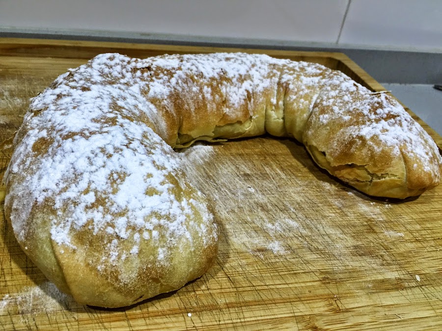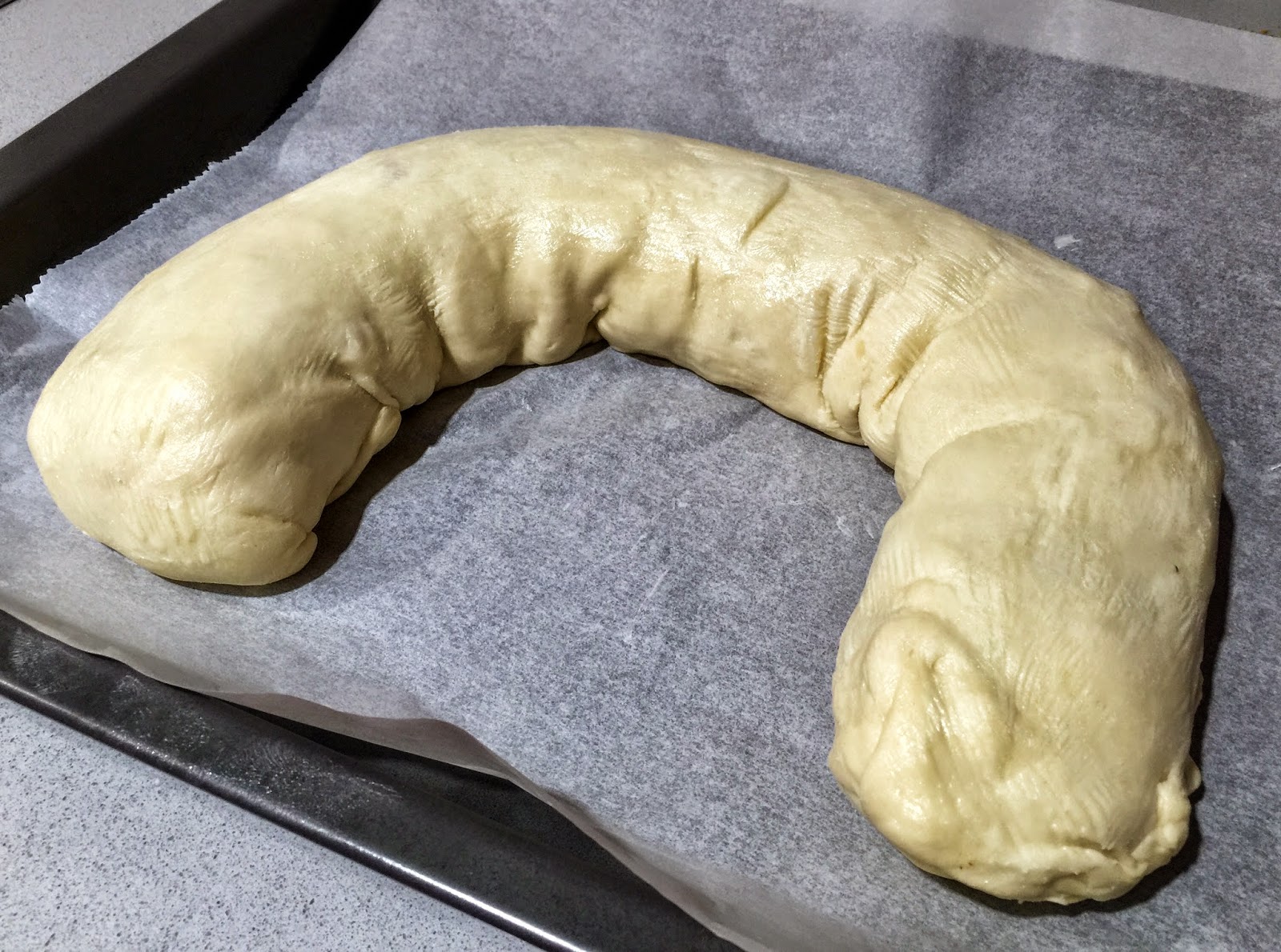 7. Ponemos nuestro apfelstrudel sobre el papel de horno, en la bandeja. Como me ha salido bastante grande en vez de dejarlo a lo largo he optado por darle forma de herradura. Pincelamos toda la superficie con la mantequilla derretida que nos queda.