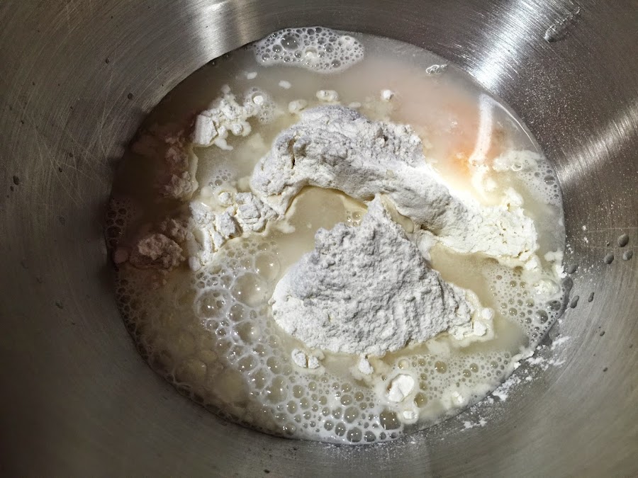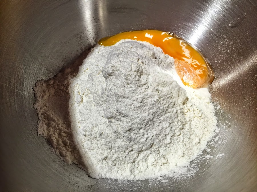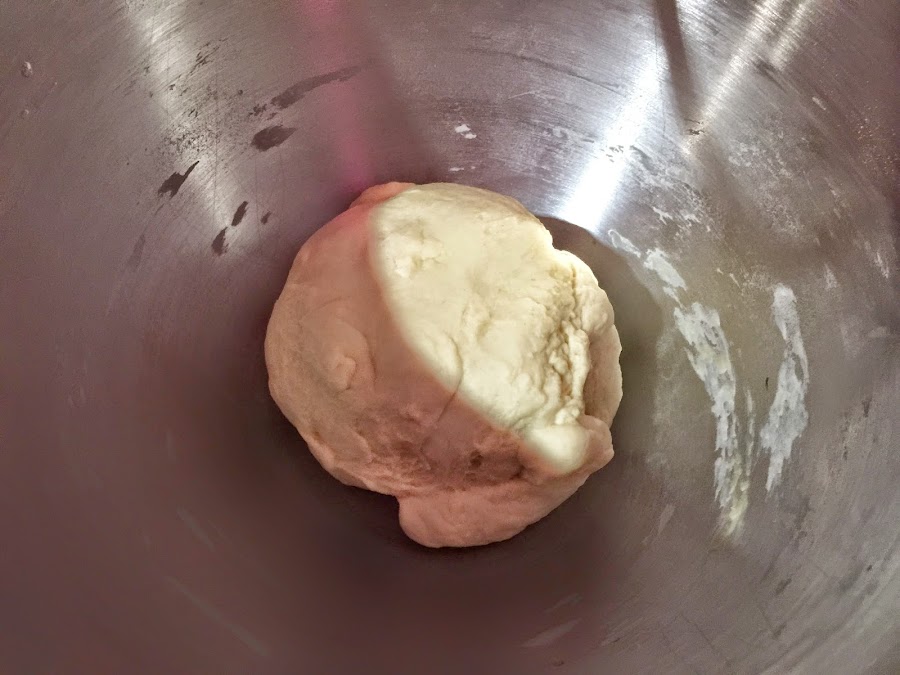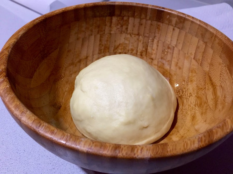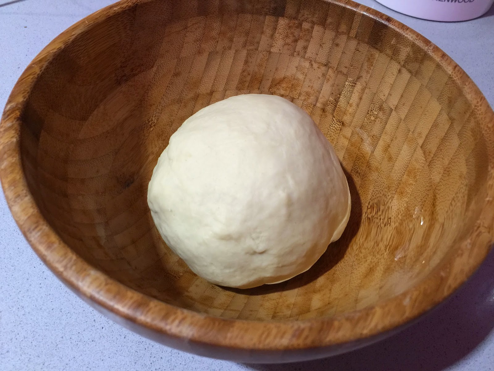 1. Ponemos en el recipiente de la KA la harina junto con la yema de huevo, el aceite, el agua templada y la pizquita de sal. Amasamos a velocidad baja durante 6 o 7 minutos. Dejamos reposar la masa 5 minutos. Amasamos durante 6 o 7 minutos mas. Dejamos de nuevo reposar la masa 5 minutos. Amasamos por última vez durante 6 o 7 minutos. Con estos amasados y pausas conseguiremos una masa muy elástica. Ponemos la masa en un bol, que habremos aceitado previamente, y la dejamos reposar, cubierta con un trapo, durante 30-45 minutos.