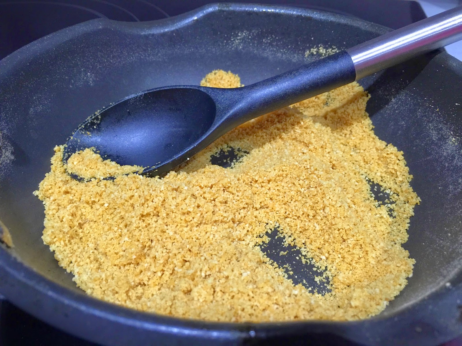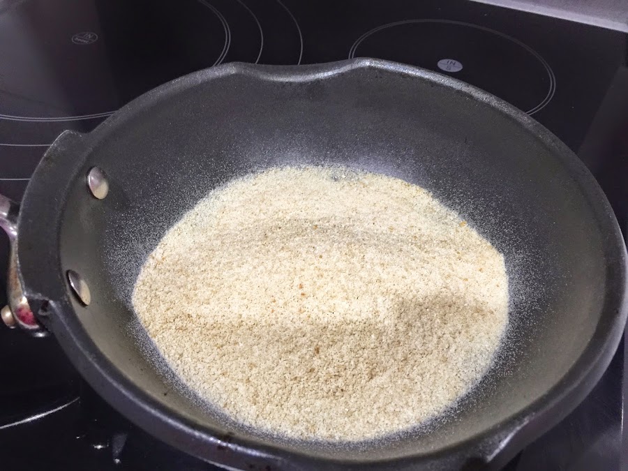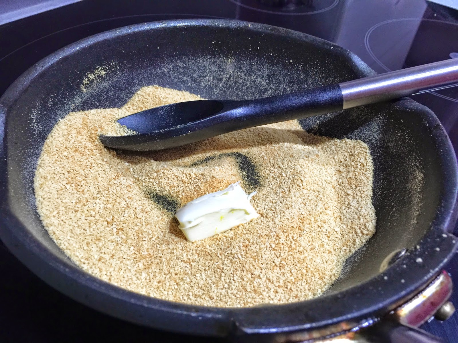 2. Mientras la masa reposa, podemos preparar los ingredientes del relleno. Ponemos a calentar a fuego medio una sartén. Ponemos en ella los 70g de pan rallado. Cuando el pan rallado empiece a tostarse, ponemos 20g de mantequilla. Dejamos unos minutos más, hasta que el pan rallado tome un color dorado. Reservamos en un bol.