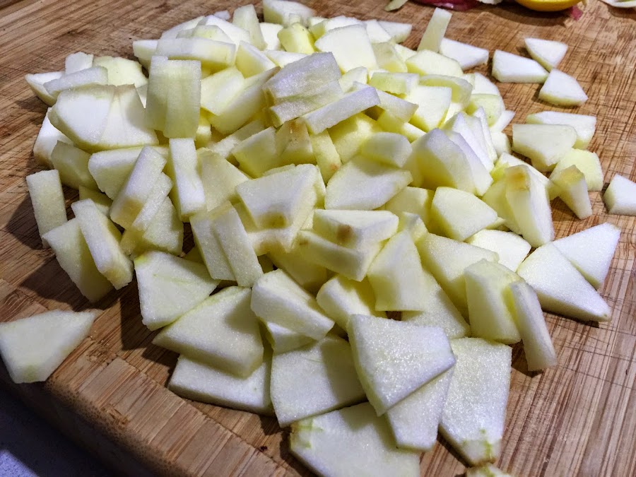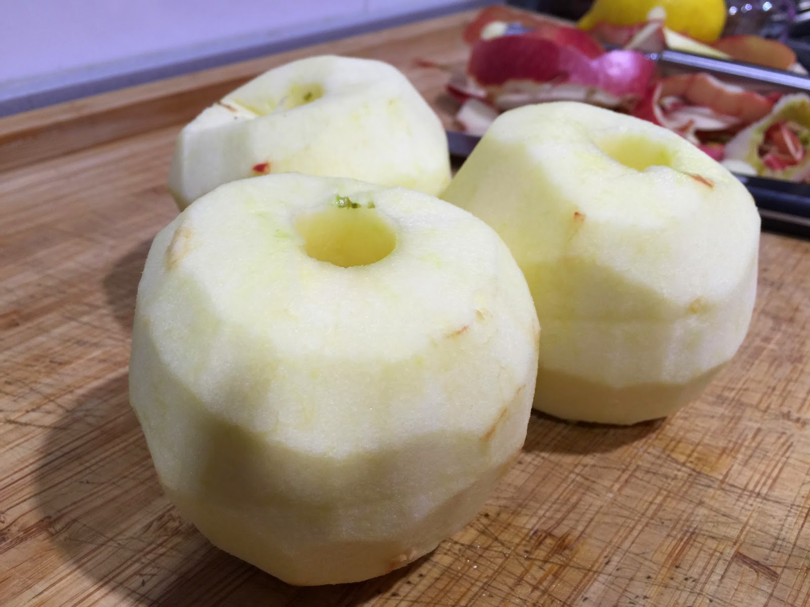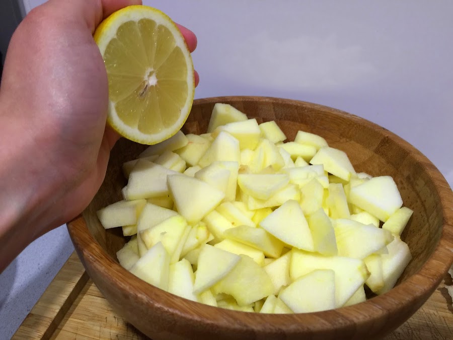 3. Seguimos con las manzanas. Las pelamos y descorazonamos. Partimos cada manzana en 8 trozos (en mitad, en cuartos y en octavos). De cada octavo laminamos la manzana en rodajas finas. Las ponemos en un recipiente con el zumo de medio limón, para así, evitar que se oxide.
