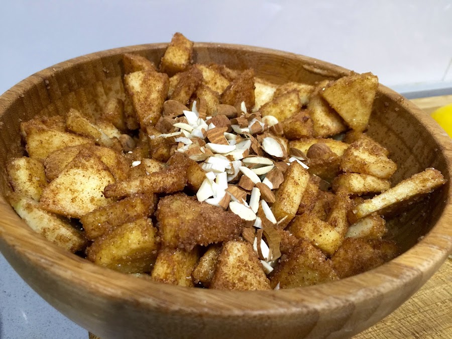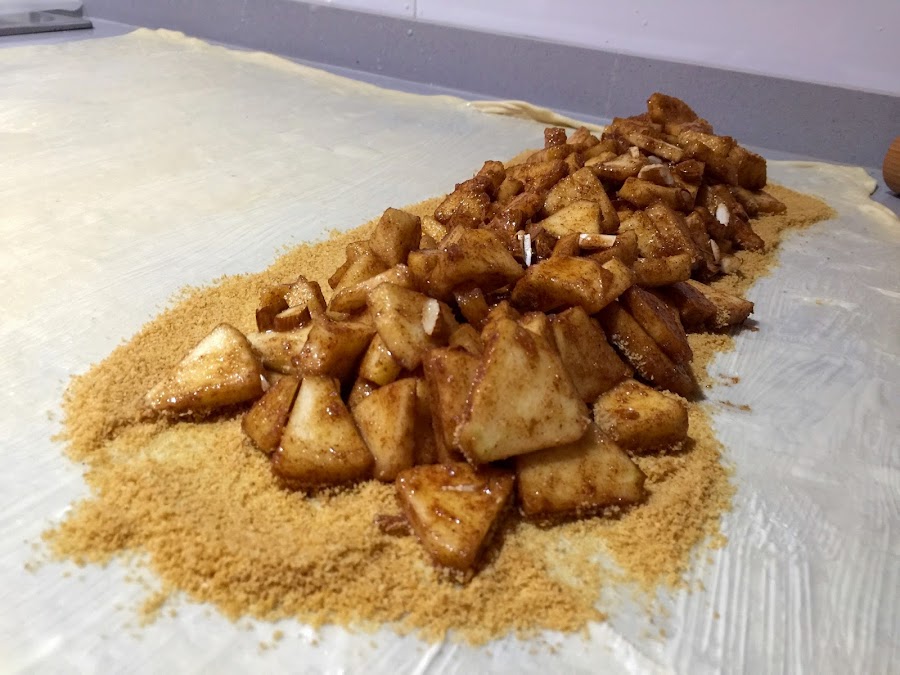 Recortamos los dos extremos para que nos quede perfecta. En uno de los laterales ponemos el pan rallado que habíamos tostado. Cubrimos el pan tostado con las manzanas que hemos adobado.