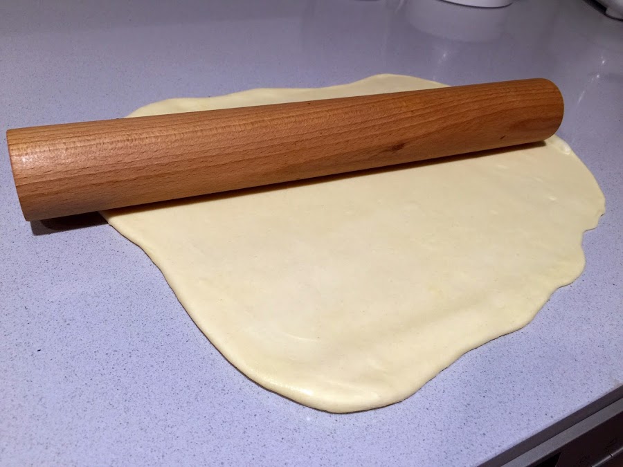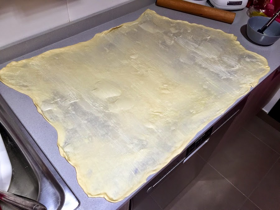 4. Precalentamos el horno a 200ºC. Cuando la masa ya haya reposado el tiempo suficiente, la ponemos sobre una superficie lisa y limpia. Con un rodillo empezamos a estirarla. Es increíble lo que esta masa da de si sin romperse. Hay que estirar y estirar hasta que la masa prácticamente sea transparente.