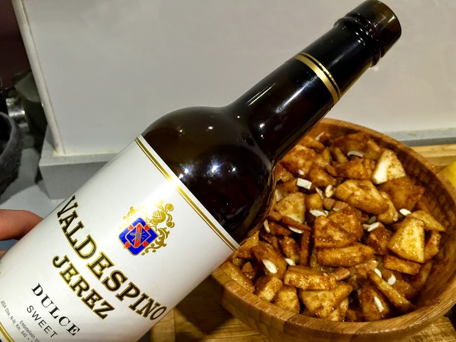 Añadimos el azúcar moreno, la canela y la almendra, que habremos cortado a trocitos. Añadimos las dos cucharadas de jerez y removemos bien hasta integrar todos los ingredientes.