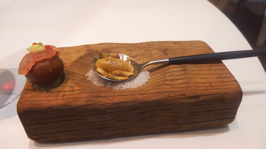 Bocados con diferentes texturas que pasan desde el estallido líquido de la tortilla de camarón al crujiente del taco halófilo. Cabe destacar el potente sabor de la sardina asada, acompañada de una untuosa emulsión de aceituna.