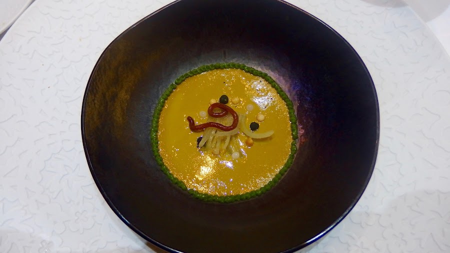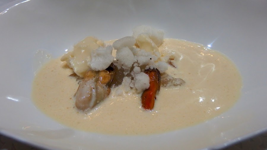 Deliciosas las sopas y salsas frías que acompañan a alguno de estos platos, como el dulce licuado de zanahorias que acompaña a las ostras encominadas y envueltas en regañá. O la potente sopa fría de escabeche que acompaña a los mejillones, un plato espectacular.