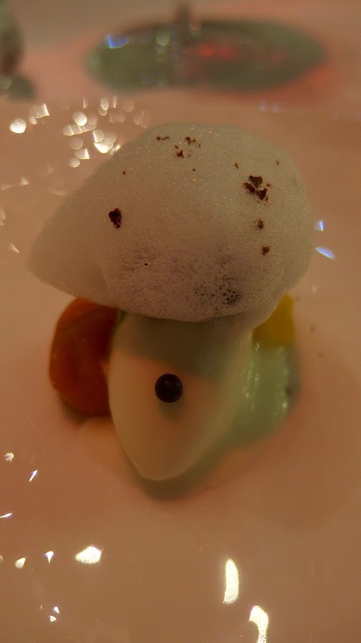 Comenzamos el menú con una bandeja de pasteles, la dulcería marina. Te presentan en la mesa una bandeja, cual encontrarías en la pastelería del barrio, en ella dos Carmelas, un trozo de tarta de San Marcos y un polvorón. Pero nada es lo que parece, delante tenemos cuatro trampantojos con un gran sabor a mar, en los que el tartar de calamares, el choco, el cangrejo y el plancton son los protagonistas. Un comienzo divertido y sabroso.