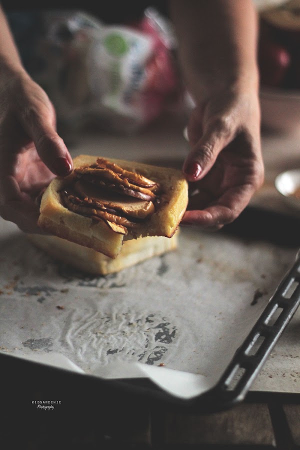 Pero si eres de las que no me sigues, te cuento que es tan sencillo como poner juntas dos rebanadas de pan, a una de ellas le haces un corte cuadrado con un cuchillo o cortapastas y hundes un poco el recorte para que se haga un hueco y dentro podamos poner luego la fruta. Este es el proceso más "complicado " que junto al corte fino de las manzanas deberá hacer un adulto.