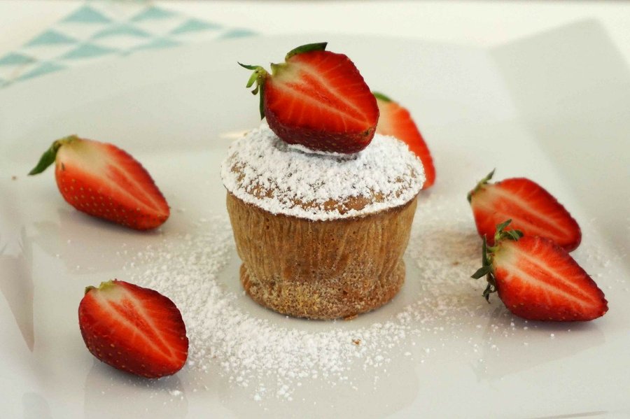 Una vez horneado desmoldar con cuidado en un plato y servir con nuestro topping favorito, en mi caso azúcar glass y fresas.
