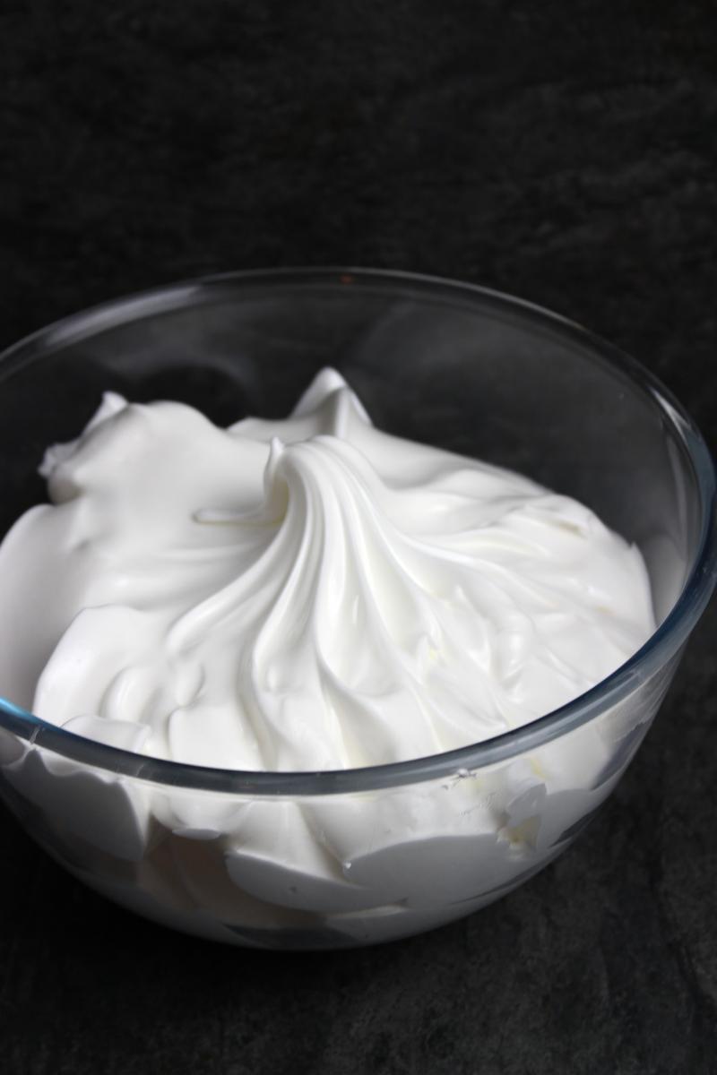 Sin parar de batir las claras, vamos añadiendo el almíbar caliente en forma de hilo fino, poco a poco, para que las claras se vayan montando y cociéndose. Tendremos que seguir batiendo hasta que el cuenco esté totalmente frío y el merengue esté bien duro (podemos añadir un par de cucharadas de azúcar glass cuando le estemos montando para darle todavía más brillo al merengue y protegerlo de la humedad ambiente)