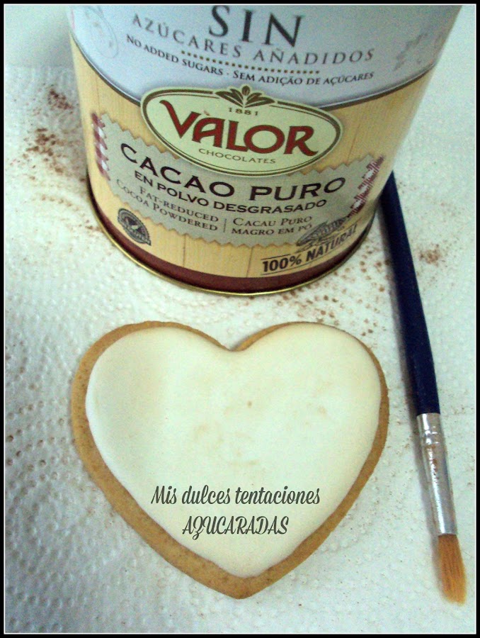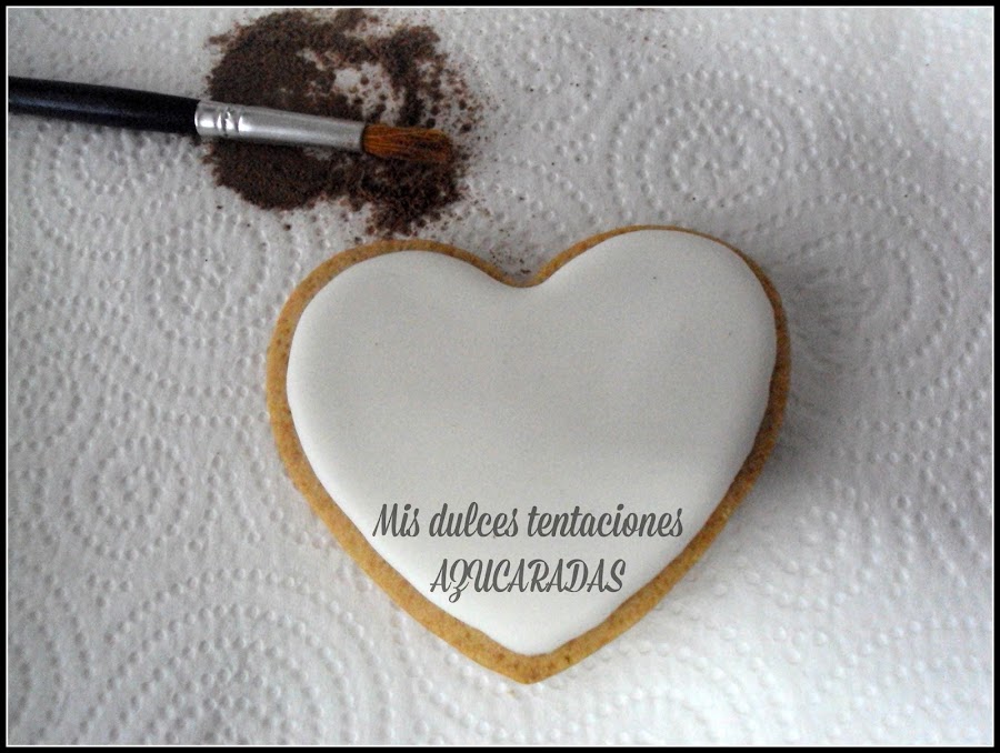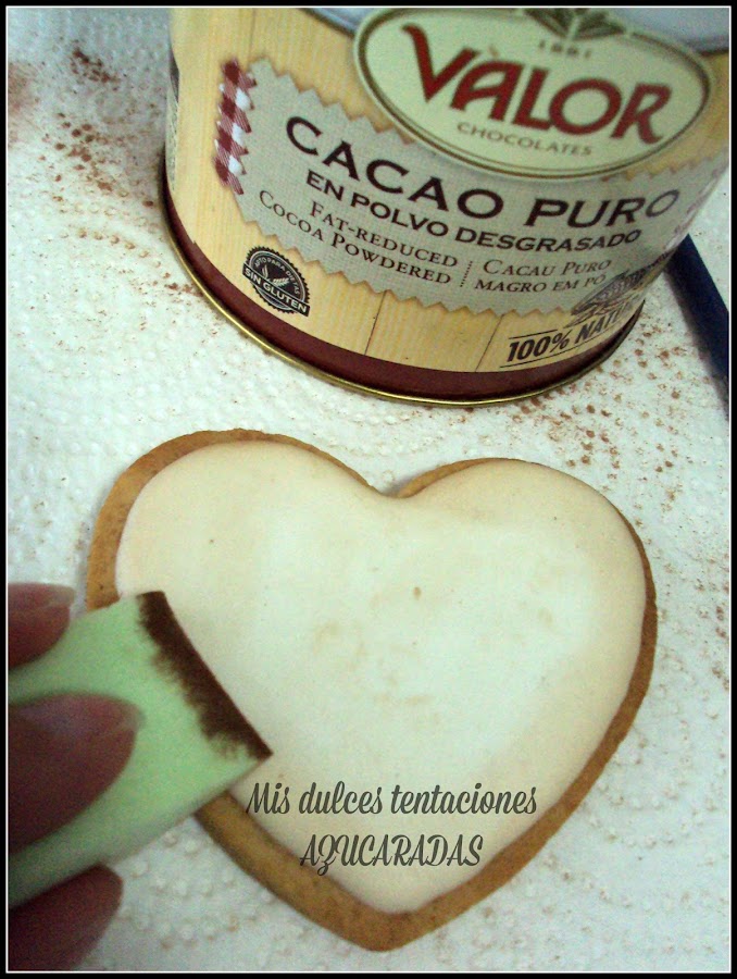 Comenzaremos glaseando la galleta en blanco y dejando secar 24 horas,para a continuación aplicar cacao en polvo con un pincel seco y conseguir el efecto envejecido.